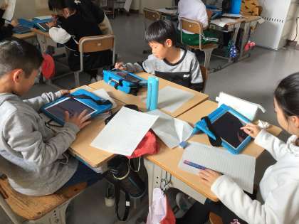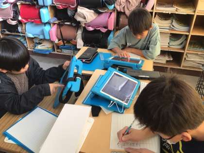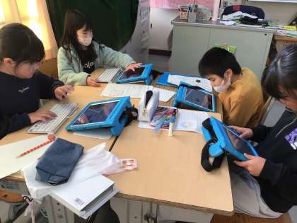 3年生の総合的な学習の時間です。食について調べています。グループで、お米、もも、だいこん、ブルーベリーなどを調べて、プリントにまとめていました。