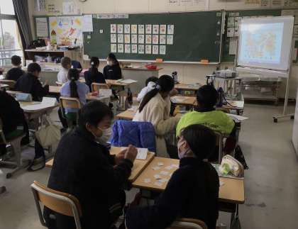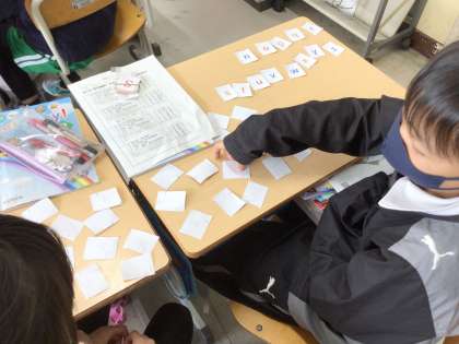 4年生の英語です。アルファベットのカードを使って学んでいます。写真は、カードで神経衰弱ゲームをしている様子です。カードをめくって発音し、同じアルファベットの大文字か小文字が出たら、ゲットできるルールです。楽しみながら、アルファベットを覚えていきます。