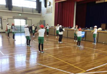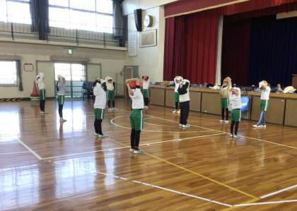 5年生の体育です。授業の最初に体育係の号令で、準備運動やストレッチを行なっています。しっかり体が動かせるように、けがをしないように準備を万全にしています。