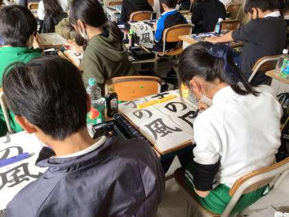 5年生の書写です。書き初め大会の練習をしています。動画でお手本のポイントを確認し、一画一画ていねいに練習しました。