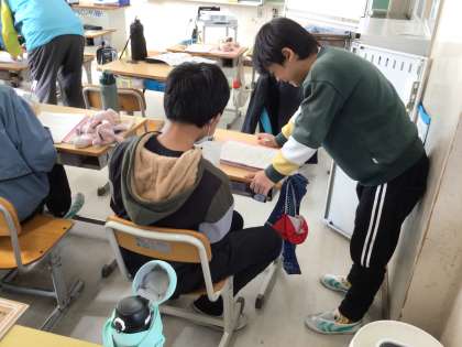 6年生の英語です。生き物のことや身近でできることを英語で話し合っています。絶滅危惧種を救うためにできることを考え、英語で会話しました。