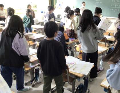曲想を考えて歌おう(4年生) 公開日 2024/12/16 更新日 2024/12/16 各学年から 4年生の音楽です。スタッカートやmf、mpなどの楽譜についている記号に合わせて、歌いました。歌の豊かな表現ができました。