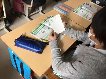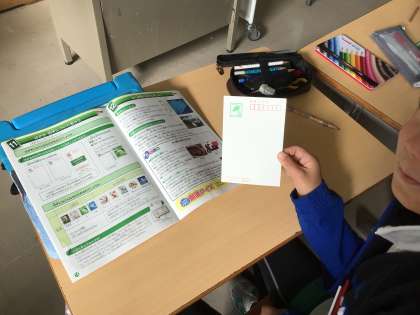 4年生の国語です。手紙の書き方を学んでいます。写真ははがきにには、森を大切にするためのマークや見えないバーコードが付けられていることを聞いて、確認している場面です。