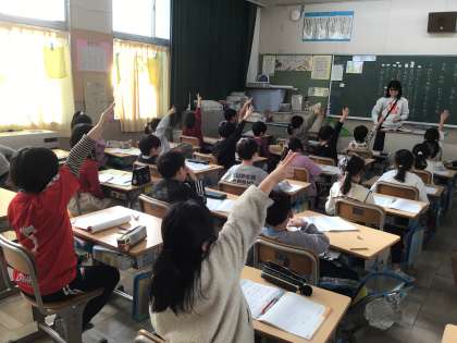 2年生の道徳です。校歌の歌詞にこめられた思いを考えて、発表し合いました。付け足しのハンドサインがたくさん上がり、「よく聞いてつなげて話そう」という授業づくりの目標が達成できていました。最後は、校長先生に校歌を聞いてもらおうという提案があり、元気いっぱいの竹村小学校の校歌を聞かせてもらいました。愛校心を感じる、とても素晴らしい歌声でした。