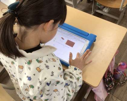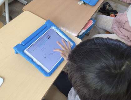 1年生の算数です。学習用タブレットのドリルアプリを使って、今までに習ったことを復習しています。どの児童が、どの問題をやったか、つまづいている問題は何かを把握し、繰り返し行うことで学力の定着に役立てていきます。
