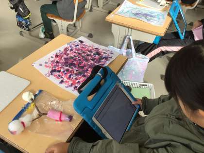 3年生の図工です。自分で作った筆やペンで、絵をかきました。作った筆やペンと完成した作品を学習用タブレットの発表ノートに写真をはり付けたり、工夫したことや感想などを書いたりして、記録として保存しています。