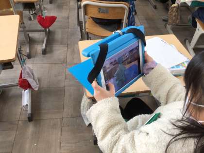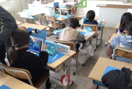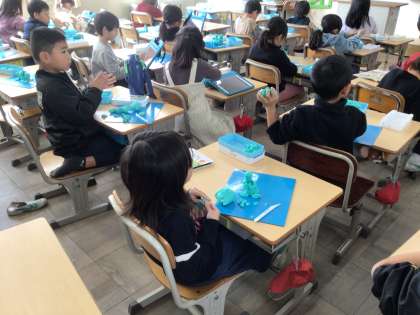2年生の図形です。粘土で、思い出を作品にしました。お賽銭をあげたことや家族でトランプをしたこと、そろばん大会に出たことなど、それぞれの思い出が形となりました。できた作品は写真に撮って、タイトルや説明をつけました。