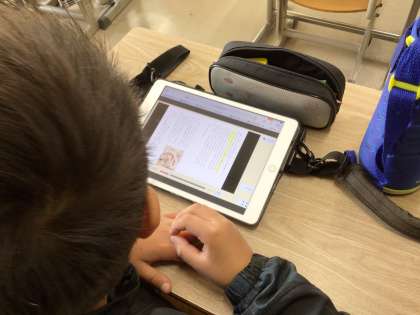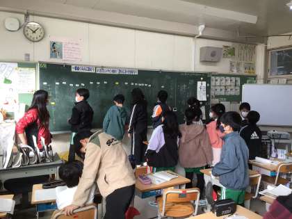 4年生の国語です。「ごんぎつね」の読み取りの学習をしています。デジタル教科書を使って、物語の内容を目と耳でしっかりと把握しました。写真下は、各自の「ごん」に対する思いを一言でまとめ、一人一人が黒板に書いている様子です。