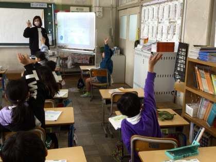 2年生の算数です。図形の学習の復習をしています。頂点や辺の数で、三角形や四角形を説明できるようになりました。