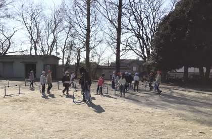 3年生の体育です。ハードルの学習をするためにみんなで準備をしています。こういう活動を通して自分は何をやったらよいかを考え、協力することの大切さも学んでいきます。