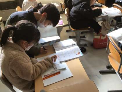 5年生の算数です。文章題を考えています。もとの数を求めるためにどんな計算式で考えればよいのかを先生に伝えたり、ペアで話し合ったりしています。