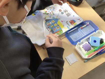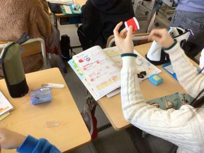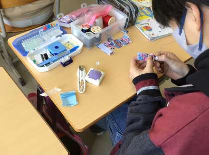 6年生の家庭科です。今までに学習した手縫いの技法を使って、小物を作っています。なみぬい、かえしぬい、かがりぬいなど、縫う場所に適した縫い方を考えて作っていきます。