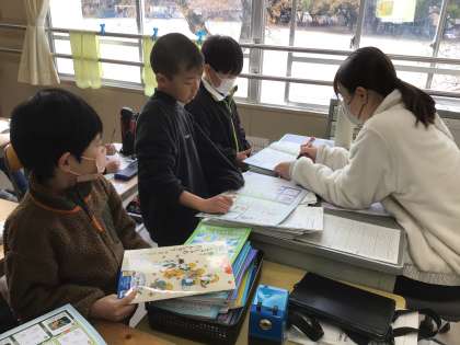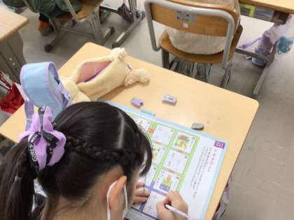 2年生の国語です。点や画の書き方を思い出して、ワークに出てくる漢字を書きます。正しい漢字を書いて進んでいくとゴールにたどりつきます。ゴールした児童は、先生に確認してもらっています。