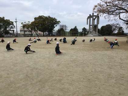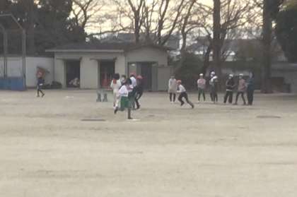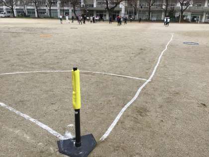 4年生の体育です。野球をもとにした「Tボール」という競技を行っています。みんなでベースなどの準備をして、しっかりと準備運動を行います。練習が始まると、「セーフ」「アウト」という元気な声が聞こえてきました。