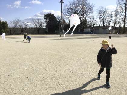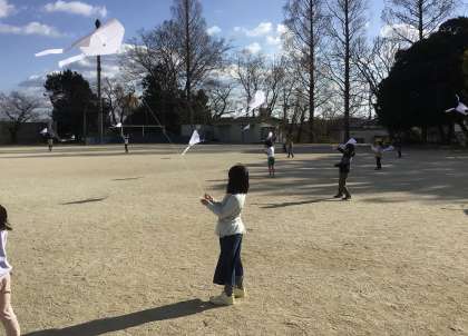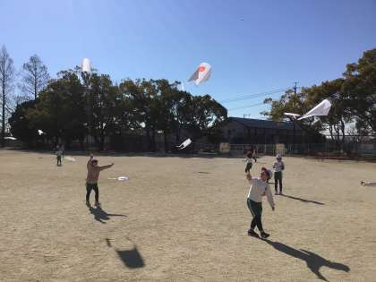 1年生の生活科です。むかしあそびの単元で、たこあげをしています。自分たちで作ったたこが高くあがると、児童たちは「見て、見て」と声をかけてくれました。