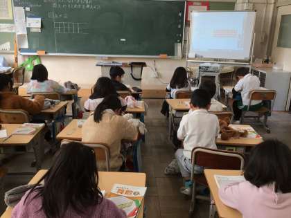 2年生の算数です。九九に出てこないかけ算を考える学習をしています。表を使ってかけ算のきまりを見つけ、九九にないかけ算を考えます。児童たちは、ものさしを使って、しっかりと表を書いていました。