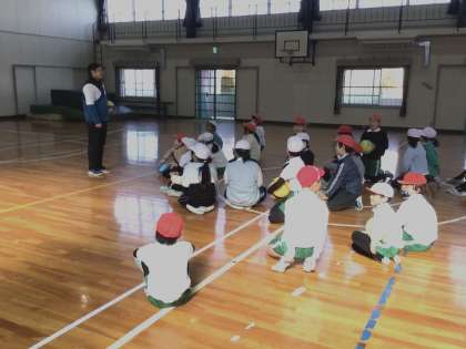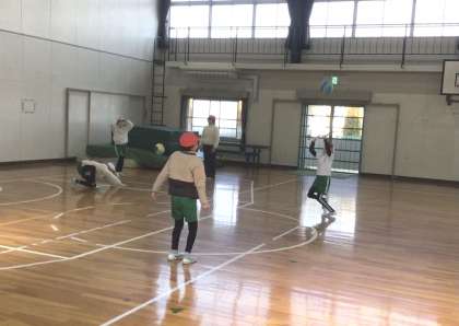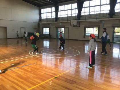 4年生の体育です。バレーボールを学んでいます。今回は、オーバーハンドパスができるようになるために、ボールをおでこの前でキャッチする練習を行っていました。段階をふんでできるようになるために、練習を工夫しています。
