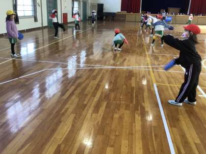 2年生の体育です。テニピンというテニスと卓球をもとにして考えられた新スポーツを学んでいます。手にはめたラケットで、ボールをタイミングよく打てるように練習をしています。
