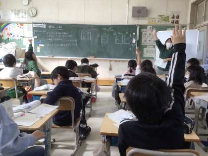 3年生の算数です。長さや水の量を小数で表す学習をしています。黒板に書かれた水の量が何Lかを質問されると、元気よく手が上がりました。