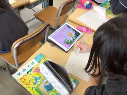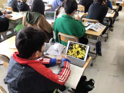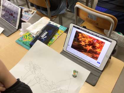 5年生の図工です。彫り進めて重ねて刷る版画を作ります。テーマは、「心をあらわす花」です。学習用タブレットでいろいろな花を調べて下絵を作っています。どんな作品が刷り上がるか、楽しみです。