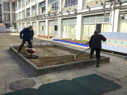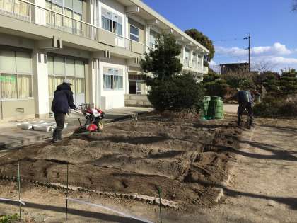 火曜日は、竹ボラさんが学校に来てくださいます。今日は、3年生が冬野菜を収穫した後の畑を耕してもらったり、中庭の砂場の整備、樹木園の木の剪定をしていただきました。