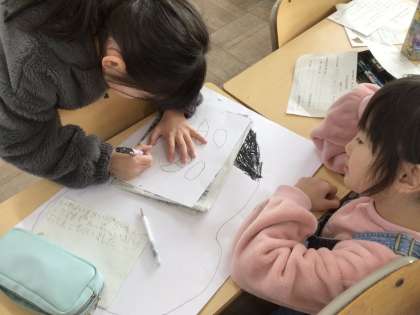 1年生の生活科です。前回、紹介したこま回し、お手玉、あやとり以外にもけん玉や福笑いを紹介する準備をしているグループもありました。