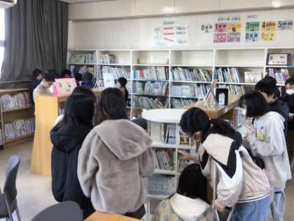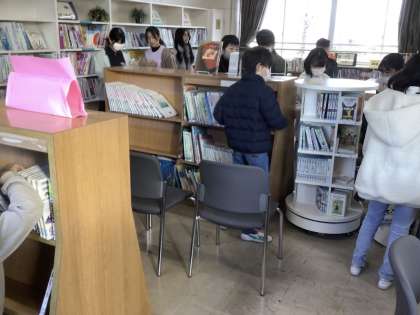 図書室の本は、竹小タイムや昼放課以外に学級ごとに借りに来ることもできます。今日の朝は、5年生が朝や休み時間に読むための本を借りに来ていました。