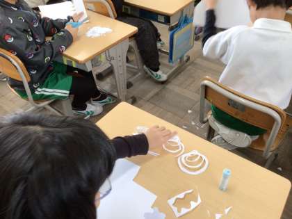 2年生の図工です。はさみを使った切り方を考えました。児童からは、「まっすぐ、ななめ、ふにゃふにゃ、ギザギザ、ぐるぐる」などの意見が出ました。その後、実際にはさみを使って作品をつくりました。