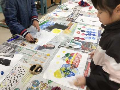3年生の図工です。パーツごとに色をつけ、バレンを使って紙に刷っていきます。カラフルな作品が出来上がりました。児童たちの作品を見ていて、蔦屋重三郎の名前が思い浮かびました。