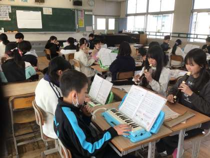 5年生の音楽です。3つのパートに分かれ、各パートの曲想が重なり合う音のひびきを意識して演奏します。リコーダーや鍵盤ハーモニカの音色が美しく重なり合うように練習しています。