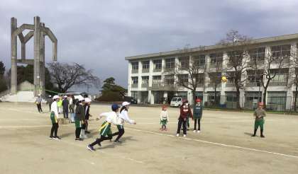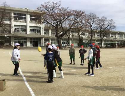 5年生の体育です。タグラグビー(安全性を高めたラグビー)をしています。球体ではないラグビーボールをパスでつないでトライするは、難しい反面、うまくいったときの達成感も大きいです。