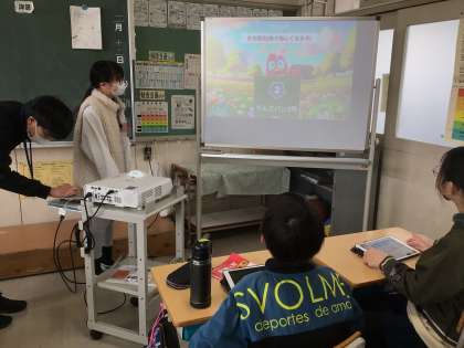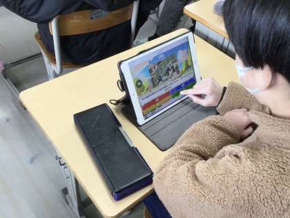 6年生の社会です。アプリを使って児童が作ったクイズ形式の問題で、学習内容の復習をしていました。問題に答えるだけでなく、問題をつくるときから復習が始まっています。「奈良の大仏の正式名称は何でしょうか?」など、歴史の問題が出題されていました。