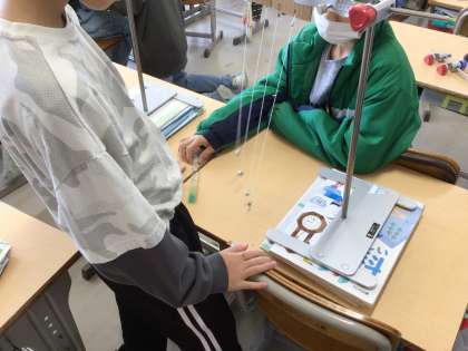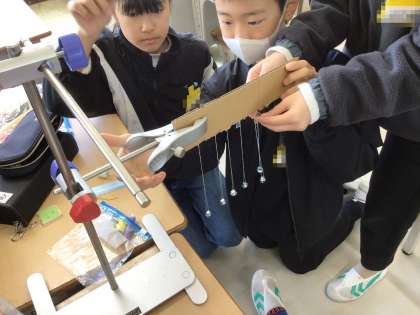 5年生の理科です。長さのちがうふりこを同時に動かすとどのような動きが見られるかを実験で確認しています。学校にも、ふりこの動きをするものがありますね。探してみてください。