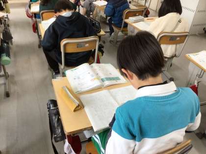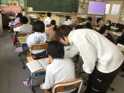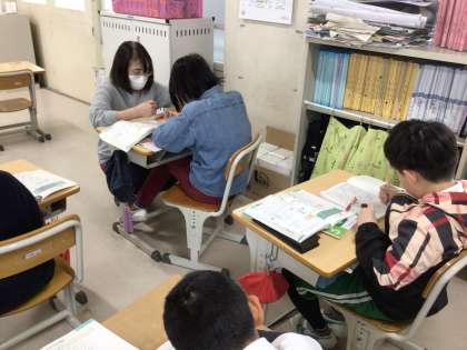 3年生の算数です。2けたをかけるひっ算を学んでいます。練習問題を解いている児童たちを担任の先生が個別に巡回し、正しく計算ができるように支援しています。