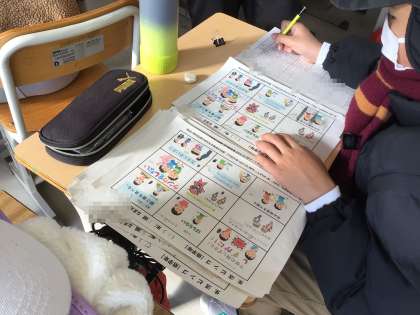 ・写真中:安心・安全な学校生活を目指した生活委員会の生活ビンゴカードの集計
