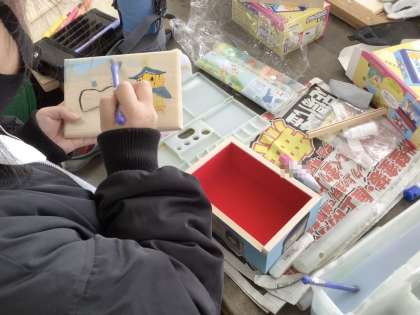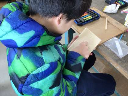 6年生の図工です。小学校での最後の作品作りです。思い出の品を入れる箱を作っています。彫刻で図柄を掘り出した後、やすりをかけて色付けを行っていきます。箱の図柄にも思い出が詰まっています。