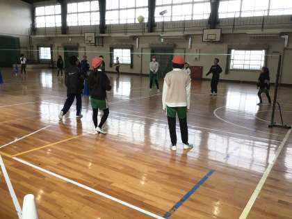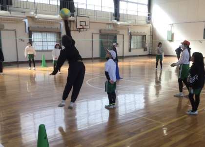 4年生の体育です。バレーボールのサーブやレシーブの練習をしています。見ていると、ジャンピングサーブを打っている児童もいました。(写真下)