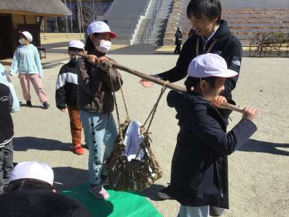 屋外では、昔の道具を体験しました。囲炉裏や担ぎ棒、あみ傘などの道具から昔の人のくらしを感じることができました。アクティブ•ラーニングツアーならではの活動です。