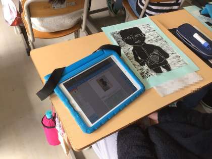 4年生の図工です。版画の作品作りを終え、学習用タブレットでふりかえりをしています。写真をとったり、作品の説明や工夫したこと、苦労したことなどを記入したりして、ふりかえりました。