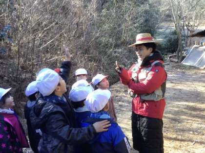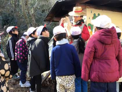 森の探検で、児童たちはたくさんのフィールドサイン(さまざまな動物たちが残した痕跡)となっているたくさんの穴を見つけ、スタッフの方からお話をお聞きしました。これは、国語で学習した「あなのやくわり」の発展学習として、自然の中にある穴を調べ、その穴の役割を考えるもので、生活科と国語の教科横断的な学習となっています。