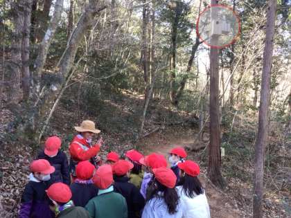 写真下の赤丸は、ムササビの巣箱です。巣箱の穴も児童たちが発見しました。