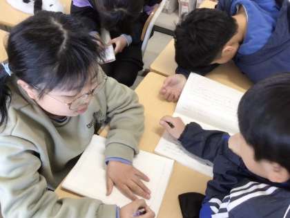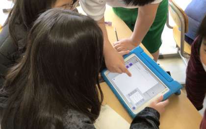4年生の国語です。グループで調べたいテーマや内容を考え、学習用タブレットのアプリを使ってアンケートを作成しています。情報収集力や情報編集力、情報伝達力を高める学びです。