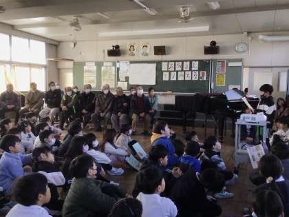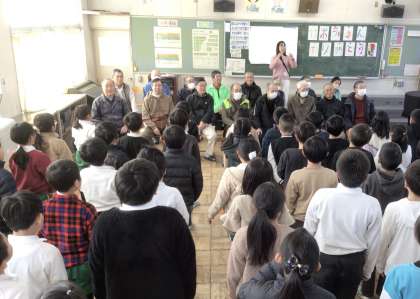 3年生全員での元気な歌や学校の畑での野菜づくりに関わって調べた野菜の発表を代表児童が行い、竹ボラさんたちに聞いていただきました。畑を耕し、土づくりをしていただいたおかげで、立派な野菜ができました。
