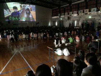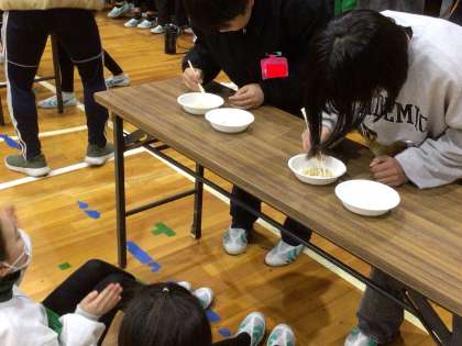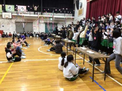 4年生は、「マツケン豆うつし!」で6年生と勝負しました。サンバのリズムにのって、豆をお皿に移していきます。サビが流れるとサンバを踊るルールです。一緒に踊る他学年の児童もいて、盛り上がりました。
