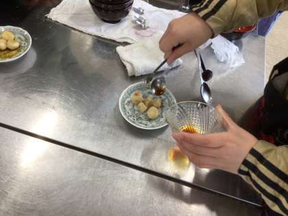5年生の家庭科です。調理実習でみたらし団子を作りました。甘辛いあんをかけて、美味しそうなみたらし団子ができました。お味は、どうでしたか?