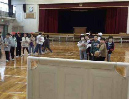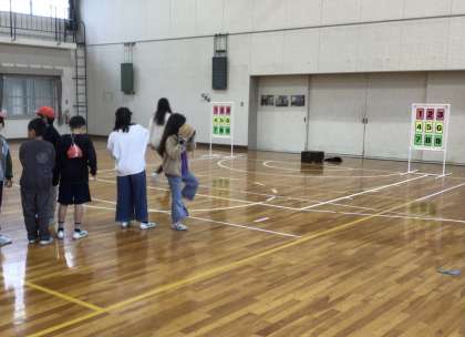 3年生のストラックアウトです。1,2年生よりも離れた距離からの挑戦です。セットポジションで、ねらいを定めて投げている児童もいました。