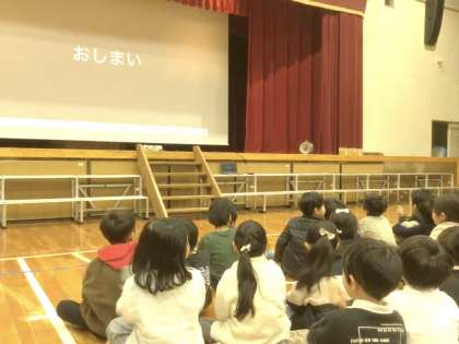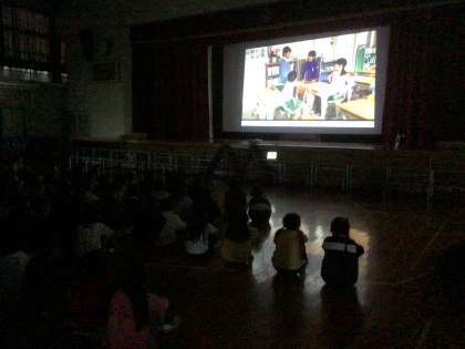 4年生から招待された環境問題の映画を見に行きました。1年生の児童たちも来ていました。今後、各学年に見てもらう予定です。