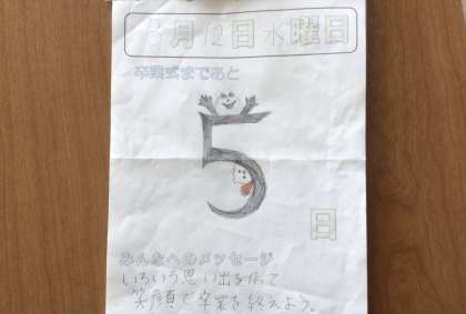 教室を回っていると、6年生の教室には誰もいませんでした。体育館で卒業式の練習中です。卒業式までのカウントダウンカレンダーや卒業を祝う会でなかよし班で贈られた花束が飾られています。