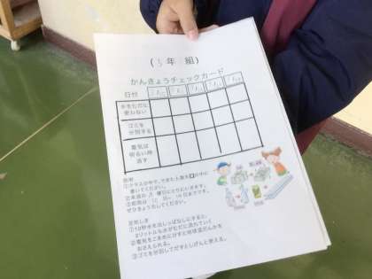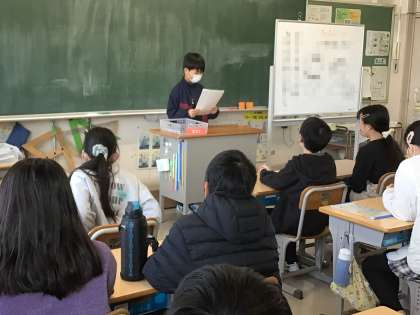 4年生が総合的な学習の時間に探究した環境問題について、自分たちにも改善できることを考えて、全校に広めています。写真は、4年生が5年生の学級に行き、環境にやさしい行動のチェックをお願いしているところです。