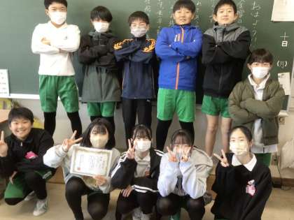 竜神地区コミュニティ会議が主催した大縄跳びで、6年生のチームが優勝しました。竜神地区コミュニティ会議青少年健全育成部会から、賞状をいただきました。おめでとうございます。